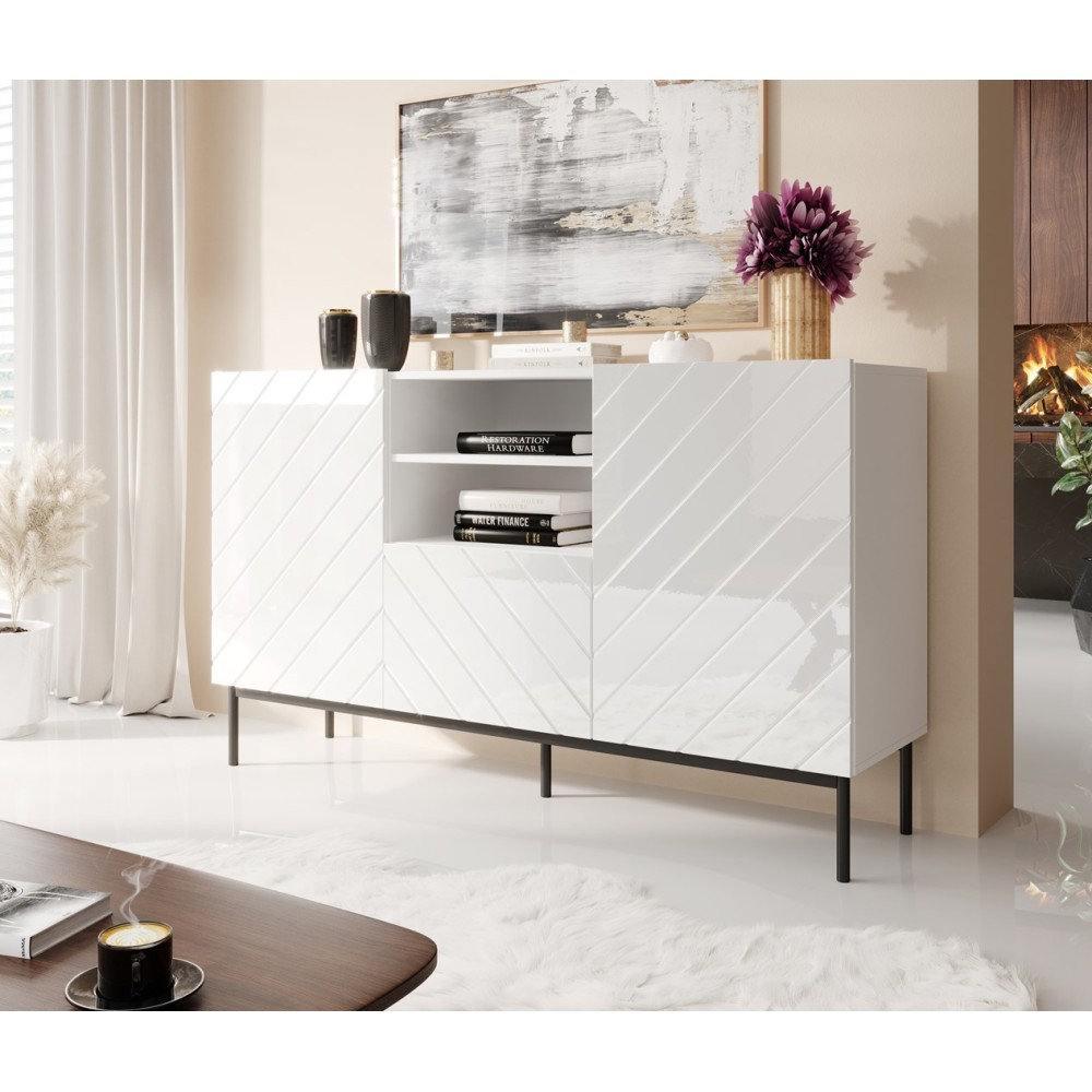 ABETO chest of drawers on black steel frame 150x42x90 white/gloss white