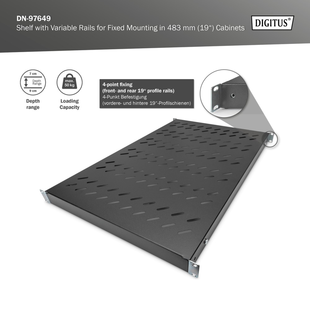 Digitus Shelf with Variable Rails for Fixed Mounting in 483 mm (19") Cabinets | DN-97649