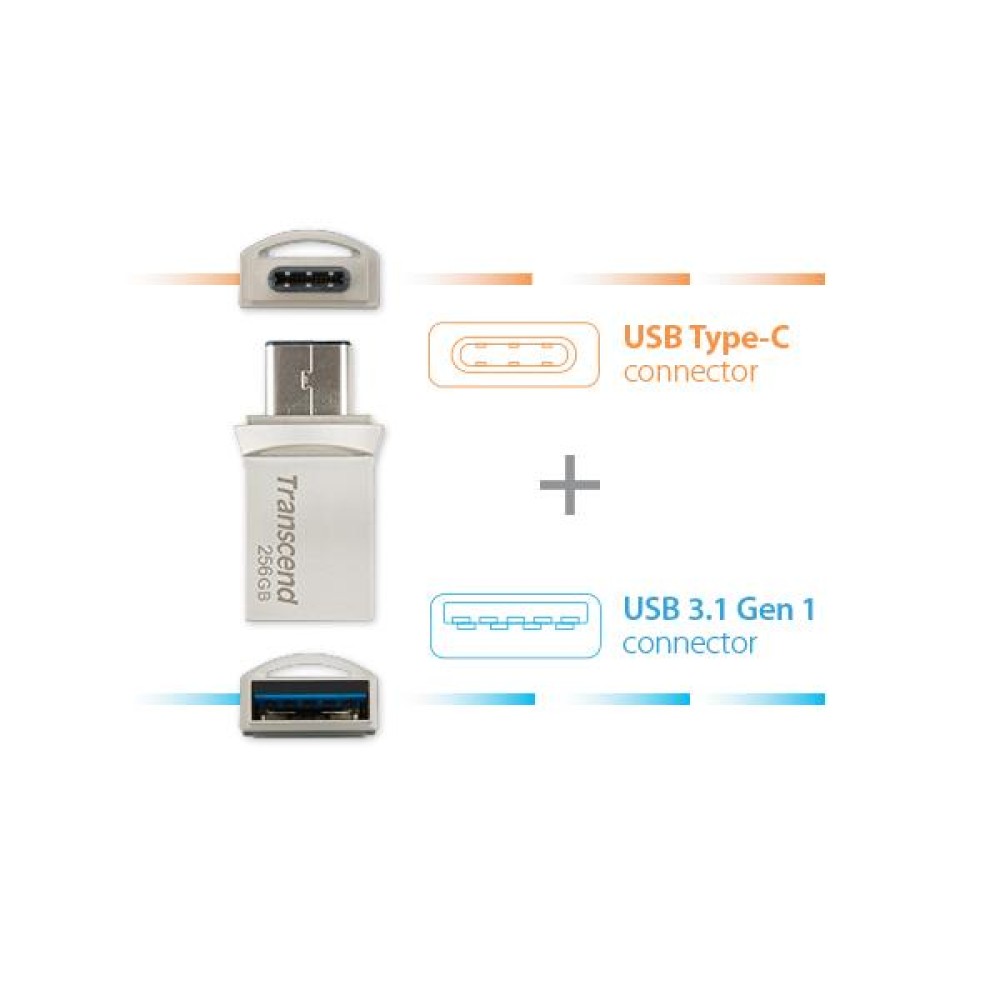 | Description | JetFlash 890 Meeting the new generation of USB Type-C technology, the JetFlash 890 USB 3.1 OTG Flash Drive features a dual connector - a reversible USB Type-C connector and a regular USB 3.1 (Gen 1) connector* - that is designed to transfer and back up your photos, music and videos between the latest USB Type-C port equipped devices such as MacBook and your PC, laptops and Mac computers. Plus, with the free-to-download Transcend Elite App, you can easily explore files on the JetFlash 890 and quickly back up all your precious files stored on your MacBook, smartphone and tablet. |