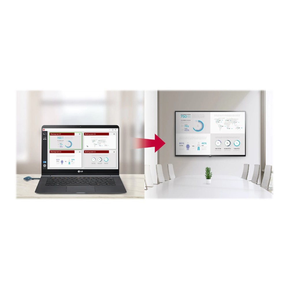Other features Connect USB type dongle devices to LG Signage for auto pairing, and disconnect them. Just by doing so, these two are ready to be connected each other; Simply share your personal PC screen to the LG Signage by connecting the USB dongle device on the PC after pairing with the Signage; Without a remote control, you can adjust the default setting values of signage (volume, picture mode, auto bright, etc.) on the One:Quick Share PC application, as well as further edit the agenda/note, presentation settings displayed in Office Meeting Mode