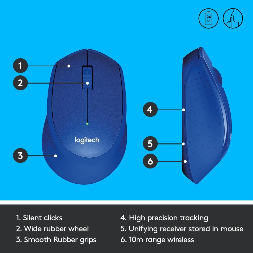 USB 2.0 , Optical , 1000 dpi , Number of buttons 3 , Wireless range 10 m , Battery AA x1 , Included Accessories Nano receiver,1 AA battery (pre-installed),User documentation , Colour Blue , Dimensions 105.4 x 67.9 x 38.4mm , Weight 0.091 kg