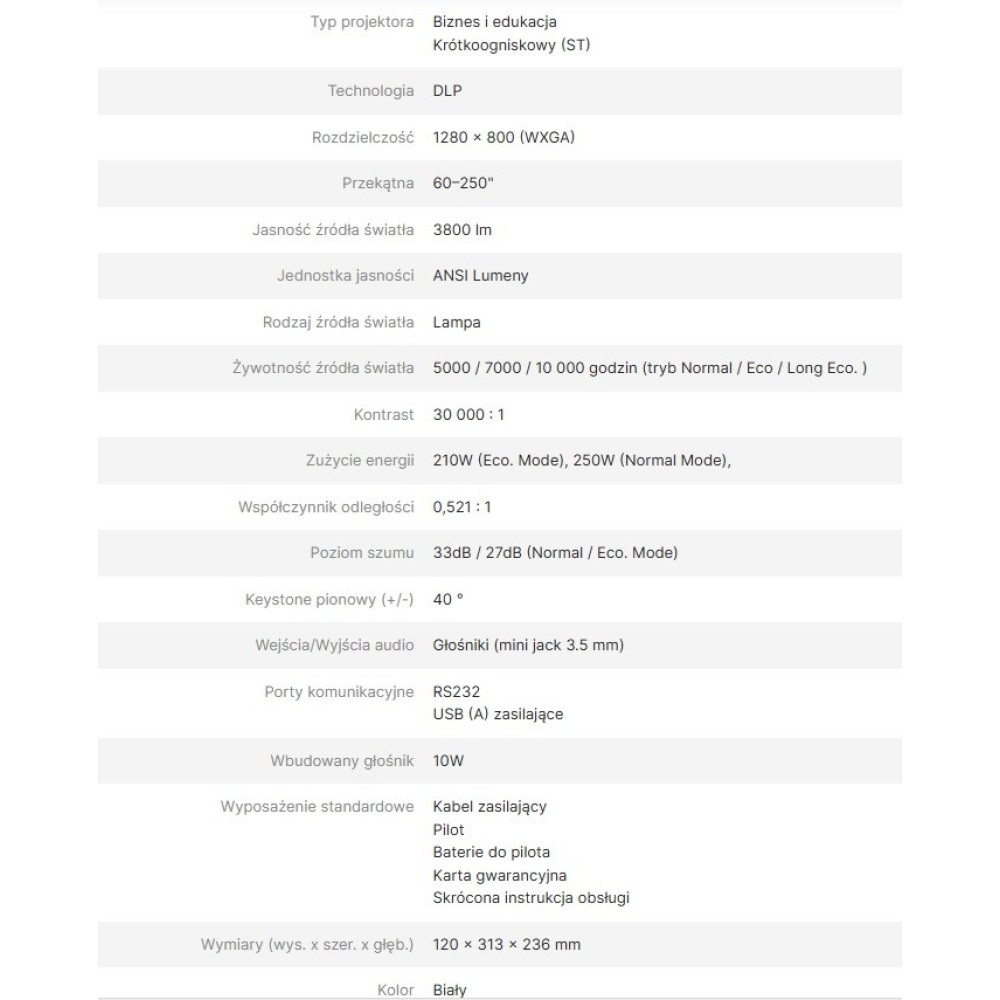 | Projector native resolution | WXGA (1280x800) |