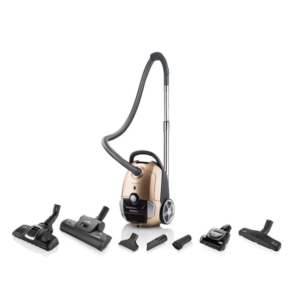 | Other features | 360° swivel wheels for easy turning, automatic power cable winding, soft wheels for protecting hard floors and furniture, 2x parking positions for floor nozzle, attachment diameter of accessories: 35mm, accessories: universal floor nozzle with retractable brush, turbo brush, small turbo brush, animal collection nozzle hair, crevice and upholstery nozzles brush, metal telescopic tube (90cm), dust bag (ETA HYGIENIC) |