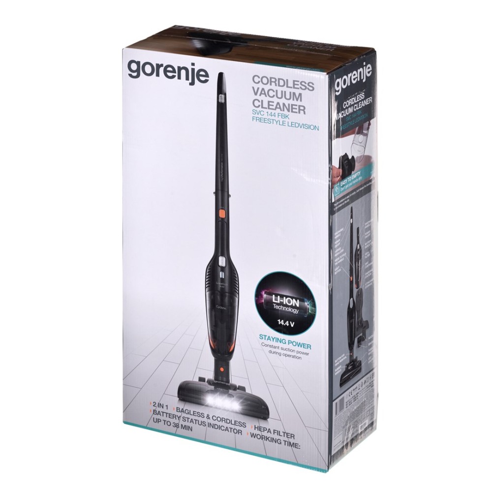 Gorenje | Vacuum cleaner | SVC144FBK | Handstick 2in1 | Handstick | - W | 14.4 V | Operating time (max) 38 min | Black | Warranty 24 month(s) | Battery warranty 24 month(s)