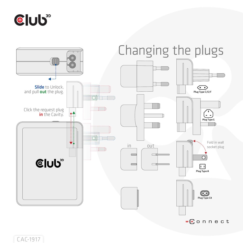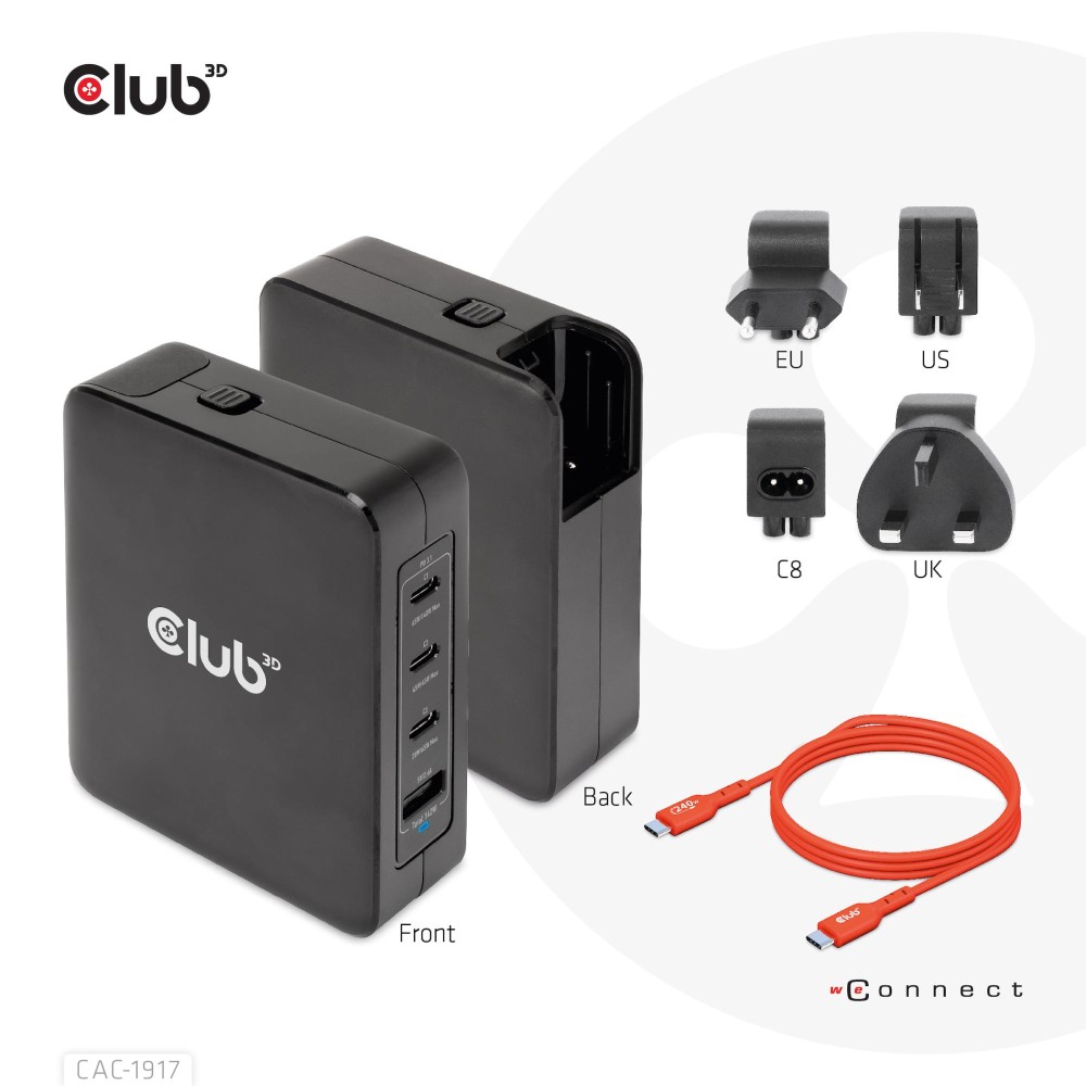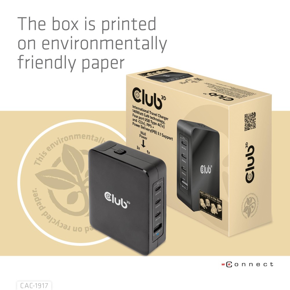 | Summary | CLUB3D International Travel Charger 140W GaN technology, Four port USB Type-A(1x) and -C(3x), PPS + Power Delivery(PD) 3.1 Support. Charger type: Indoor, Power source type: AC, Charger compatibility: Universal. Input voltage: 100 - 240 V, Maximum output voltage: 28 V. USB Type-C ports quantity: 3, Fast charging, Power protection features: Over current, Over voltage, Overheating, Short circuit. Product colour: Black |