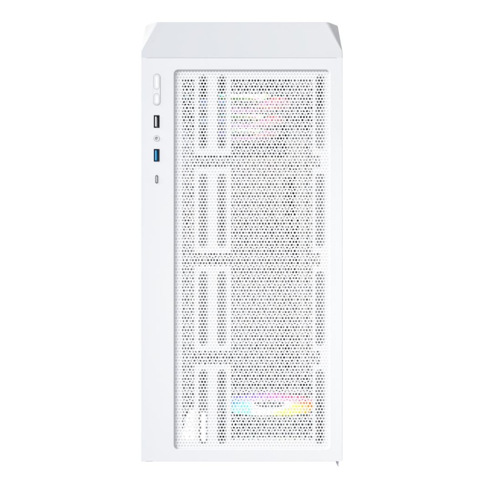 Передняя панель выполнена в виде сетки с пористостью до 33%, что обеспечивает отличный воздушный поток и стабильную температуру внутри корпуса. В комплект входят четыре установленных ARGB-вентилятора с 25 встроенными режимами подсветки, которые можно переключать кнопкой или синхронизировать с материнской платой.