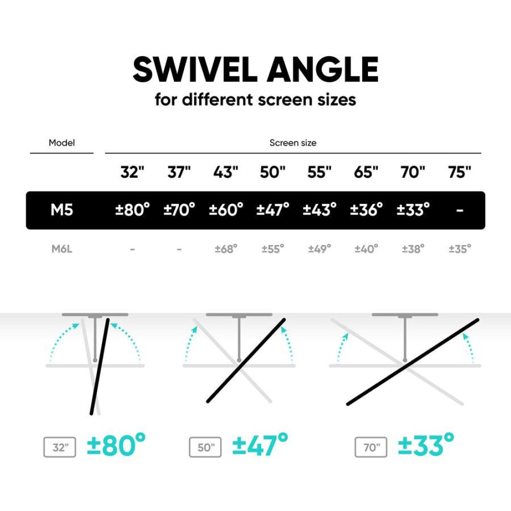 | Description | ONKRON Tilting and swiveling Wall Mount for 37"- 70" screen, max 36 kg, VESA up to 400x400 |