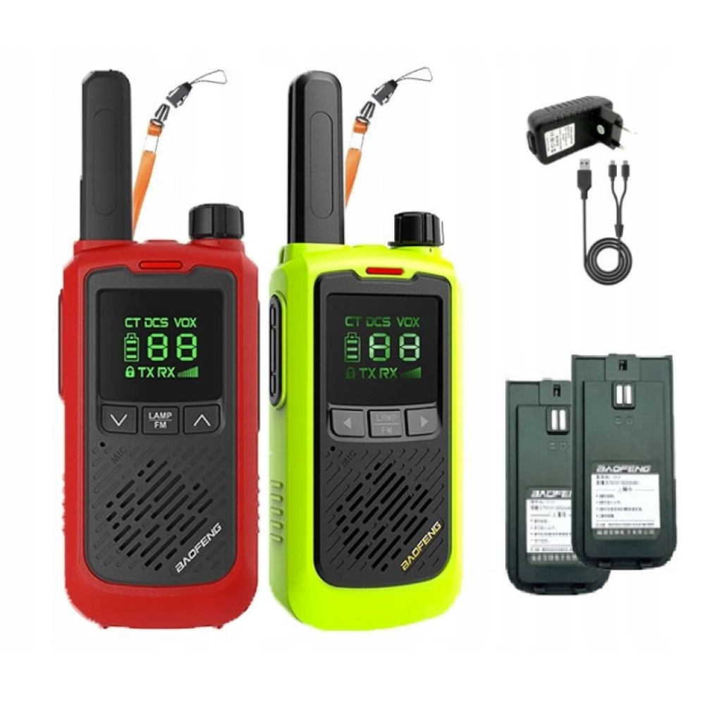 2x Baofeng BF-T17 PMR radio, 2x Rechargeable battery 1x, Dual cable 2x, USB 1x, USB power adapter to work with cables, 2x Lanyard |