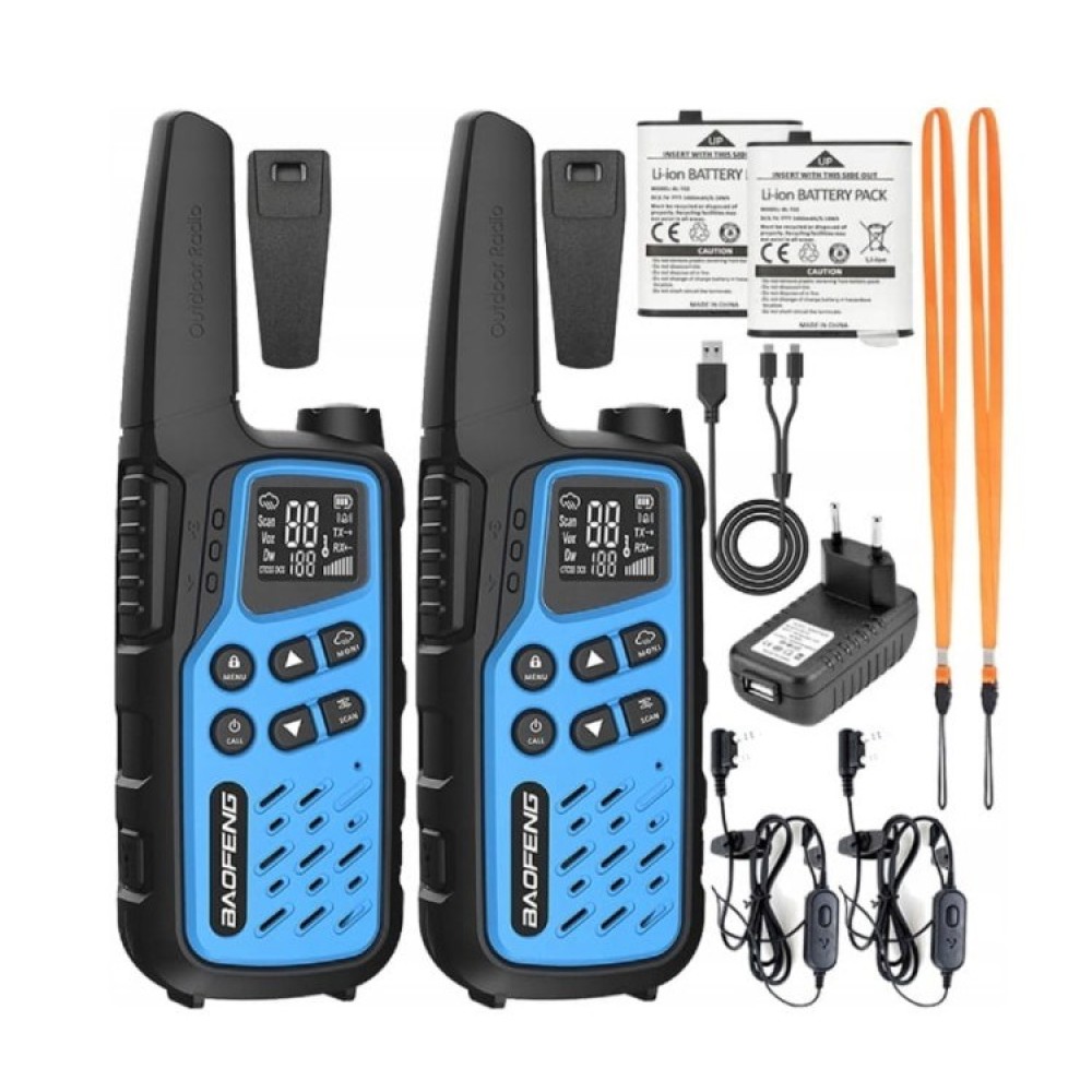 2x PMR Radio Baofeng BF-T25,2x 3,7V 1400mAh battery, 2x PTT-1,1x AC adapter (EU) 230V/USB, 1x USB charging cable, 2x lanyard |