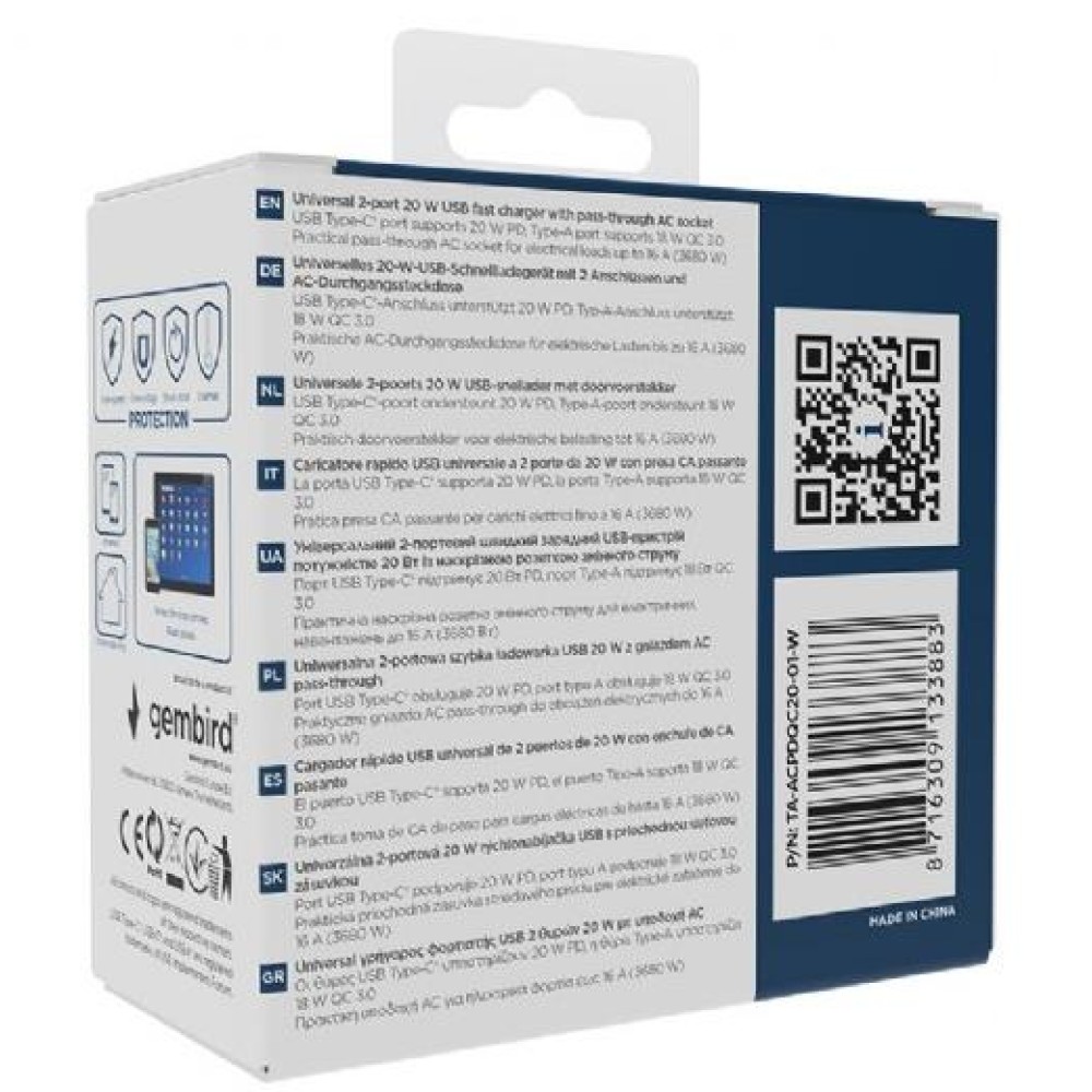 CHARGER USB UNIVERSAL 20W WHT/2P AC TA-ACPDQC20-01-W GEMBIRD