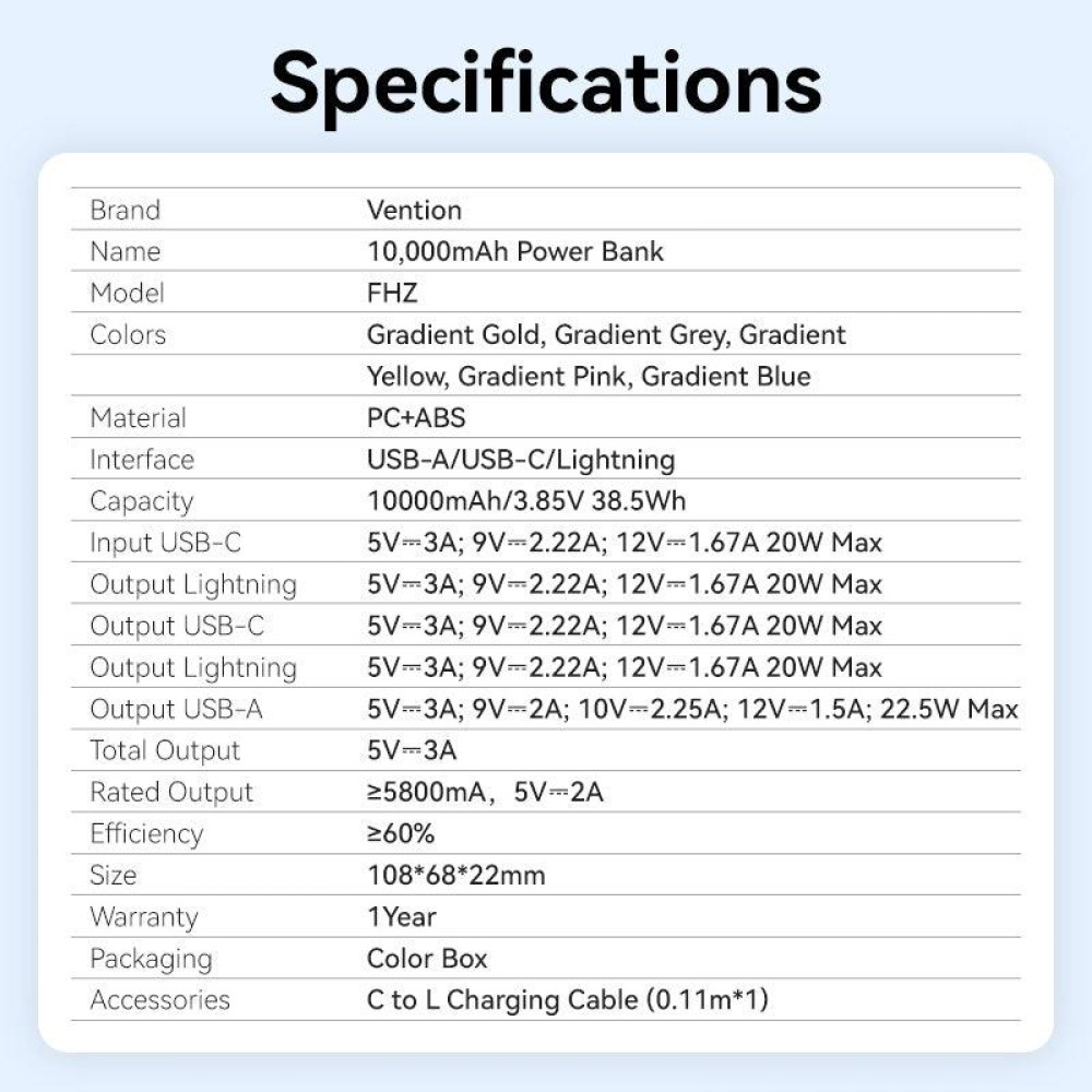 POWER BANK USB 10000MAH 22.5W/GRAY FHZM0 VENTION