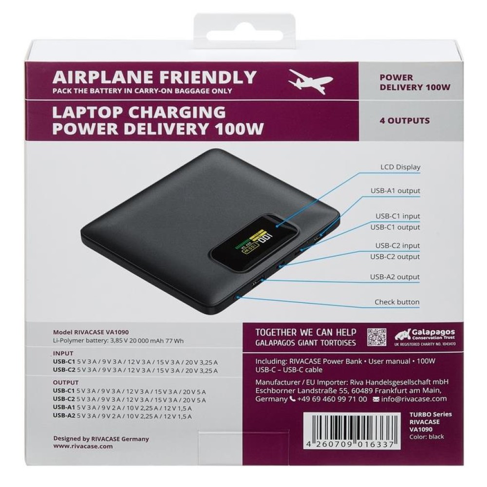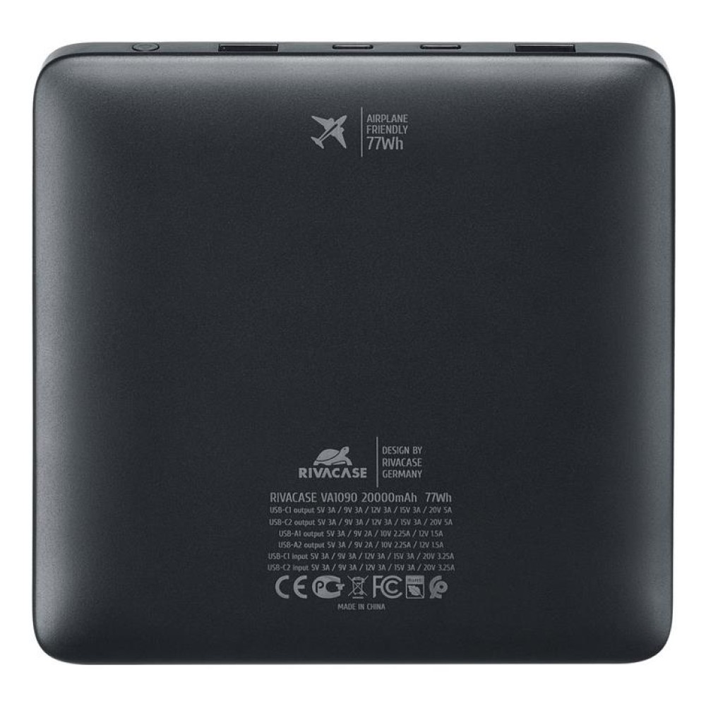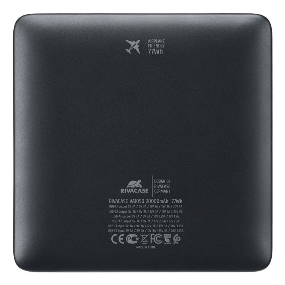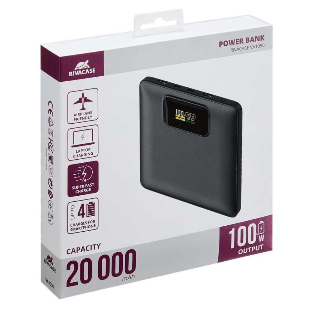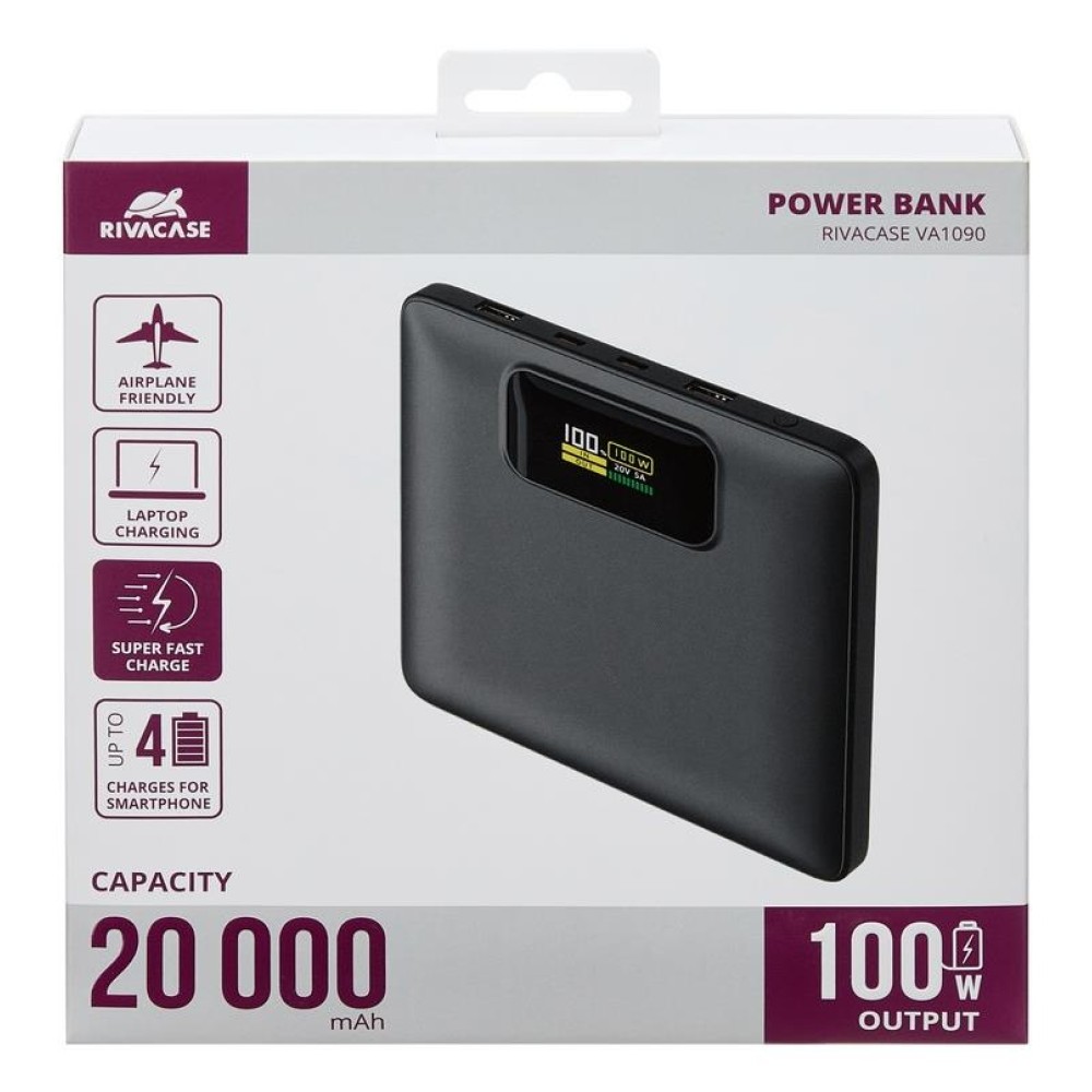 | Summary | Rivacase Turbo. Емкость батареи: 20000 mAh, Технология батареи: Литий-полимерная (LiPo), Технология быстрой зарядки: Power Delivery 3.0, Quick Charge 3.0, Напряжение батареи: 3,85 V. Количество выходов USB A: 2, Количество USB портов С-типа: 2. Ток на выходе: 5 A. Цвет товара: Черный |