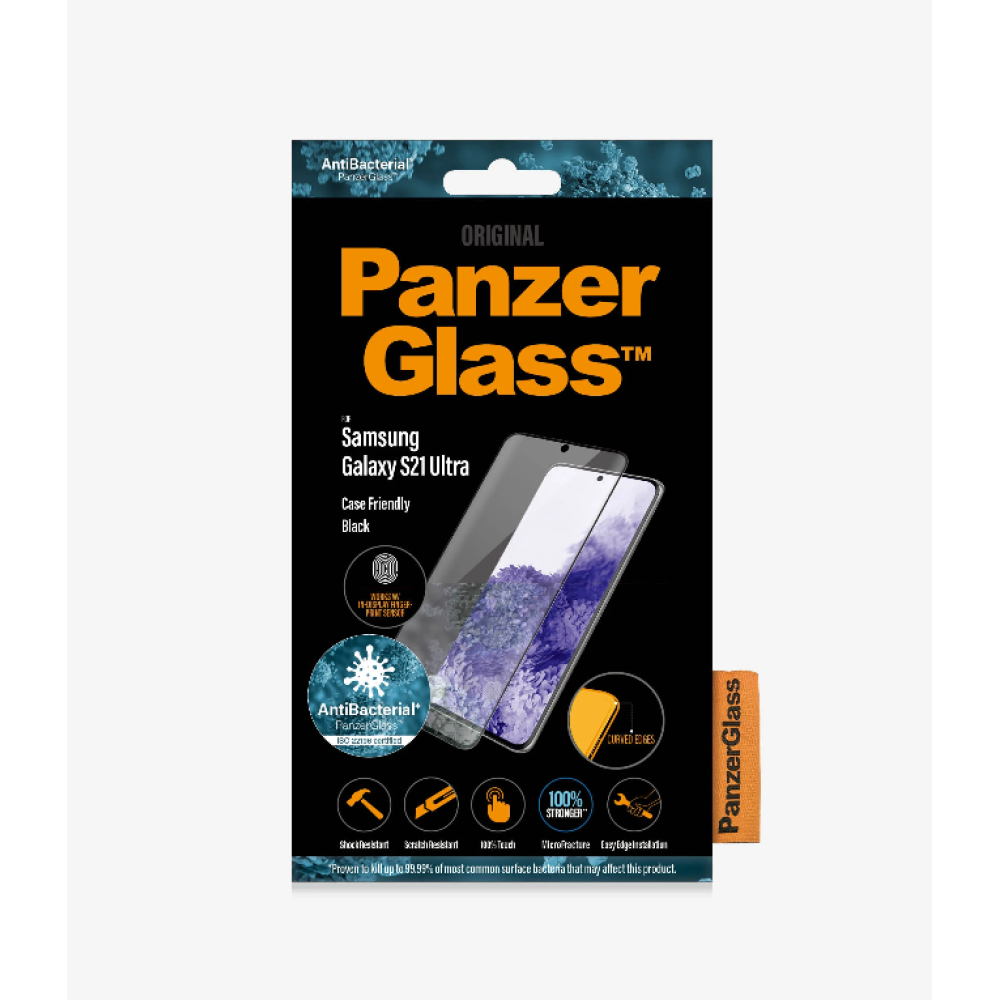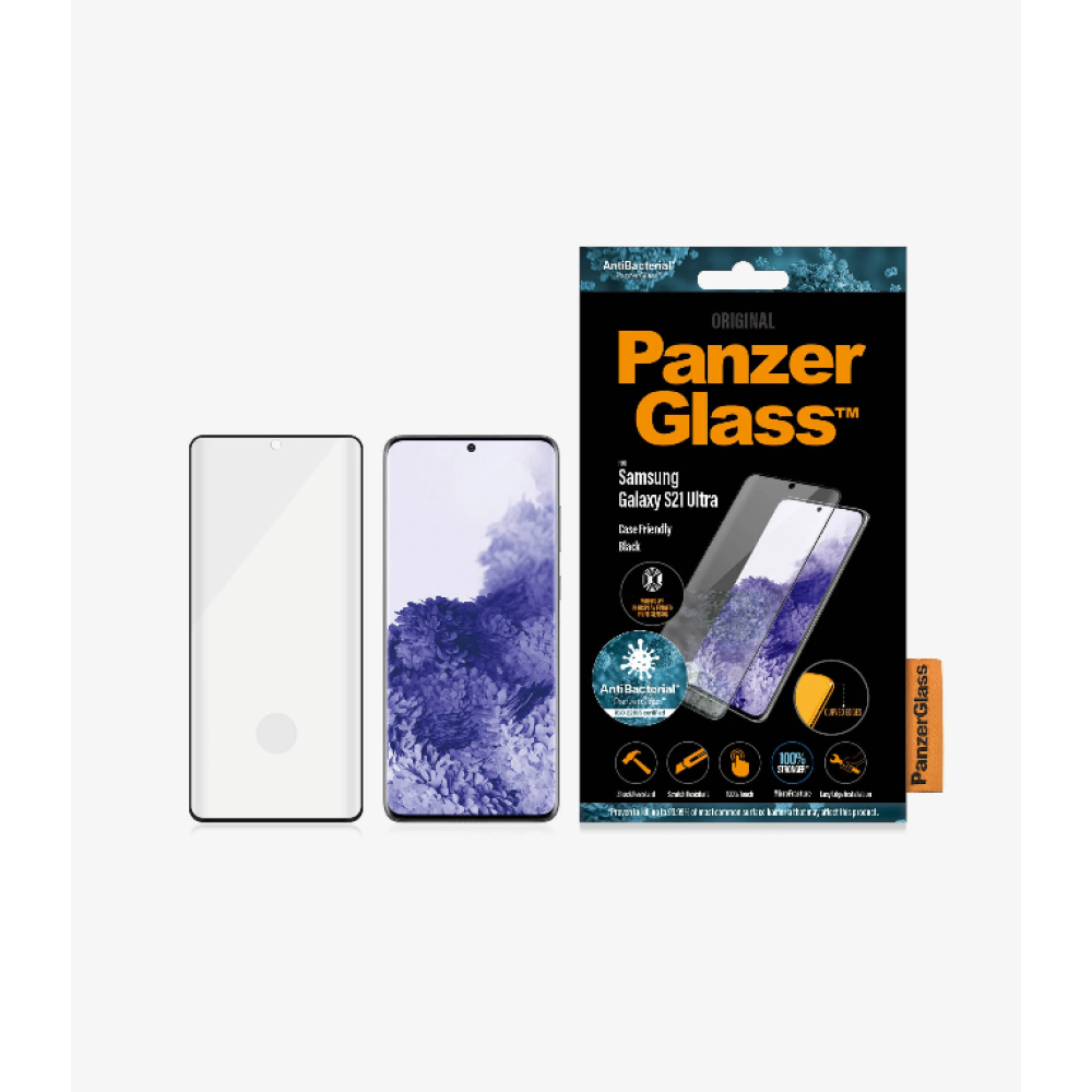 PanzerGlass | Samsung | Galaxy S21 Ultra Series | Antibacterial glass | Black | Case Friendly, Compatible with the in-screen fingerprint reader | Antifingerprint screen protector